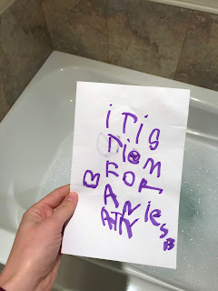 Thomas and Brooklyn made me a bath and Brooklyn wrote me this not. "It is time for a nice bath. Have a nice bath."